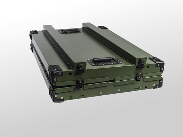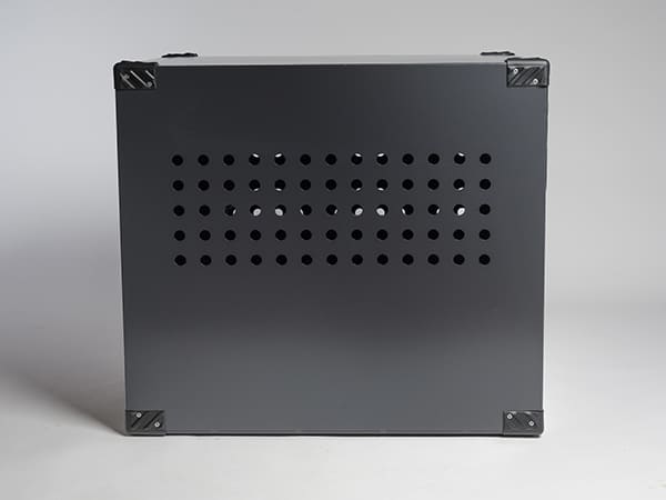 Puerta frontal perforada tipo “+”, ventilación 360°, esquinas protegidas y asa superior.
