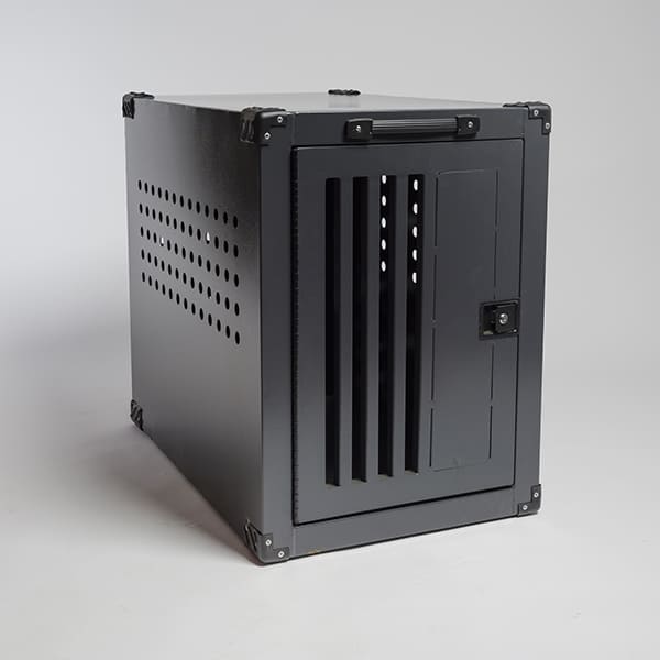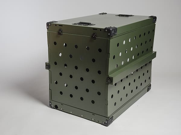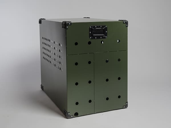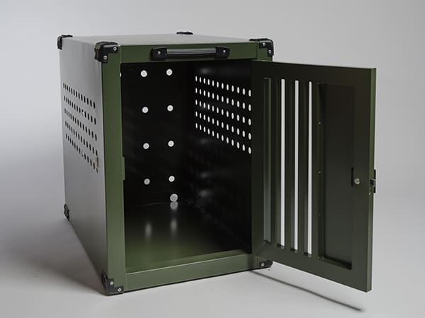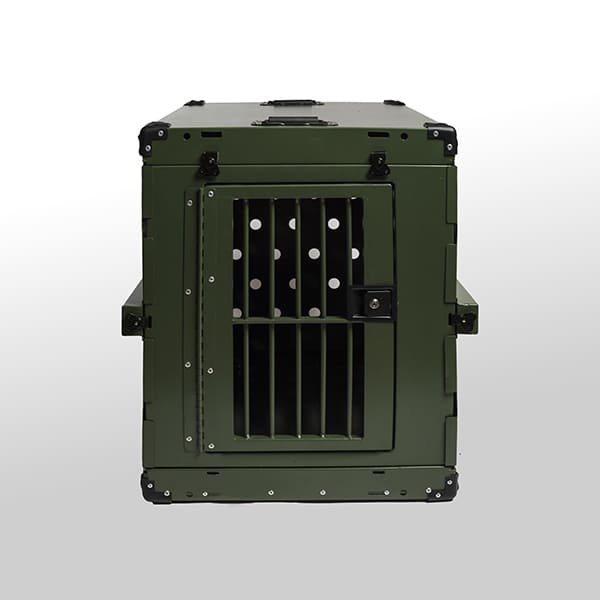 Puerta reforzada con barrotes, ventilación perimetral y manijas para traslado.